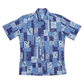 Pineapple Leaves Tapa Block Blue Men's Aloha Shirt